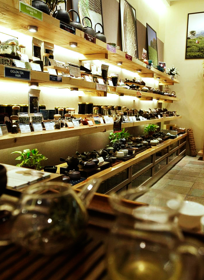 Boutique for tea leaft and tea sets. Material selected was dark slate flooring and solid pine. Linear solid pine shelves with under counter light provide main display and attraction. This textured finishes reflect a Japanese village environment giving contrast to the refined and crafted tea sets. Shopfront was designed with maximum opening allowing free flow of traffic from mall to shop.